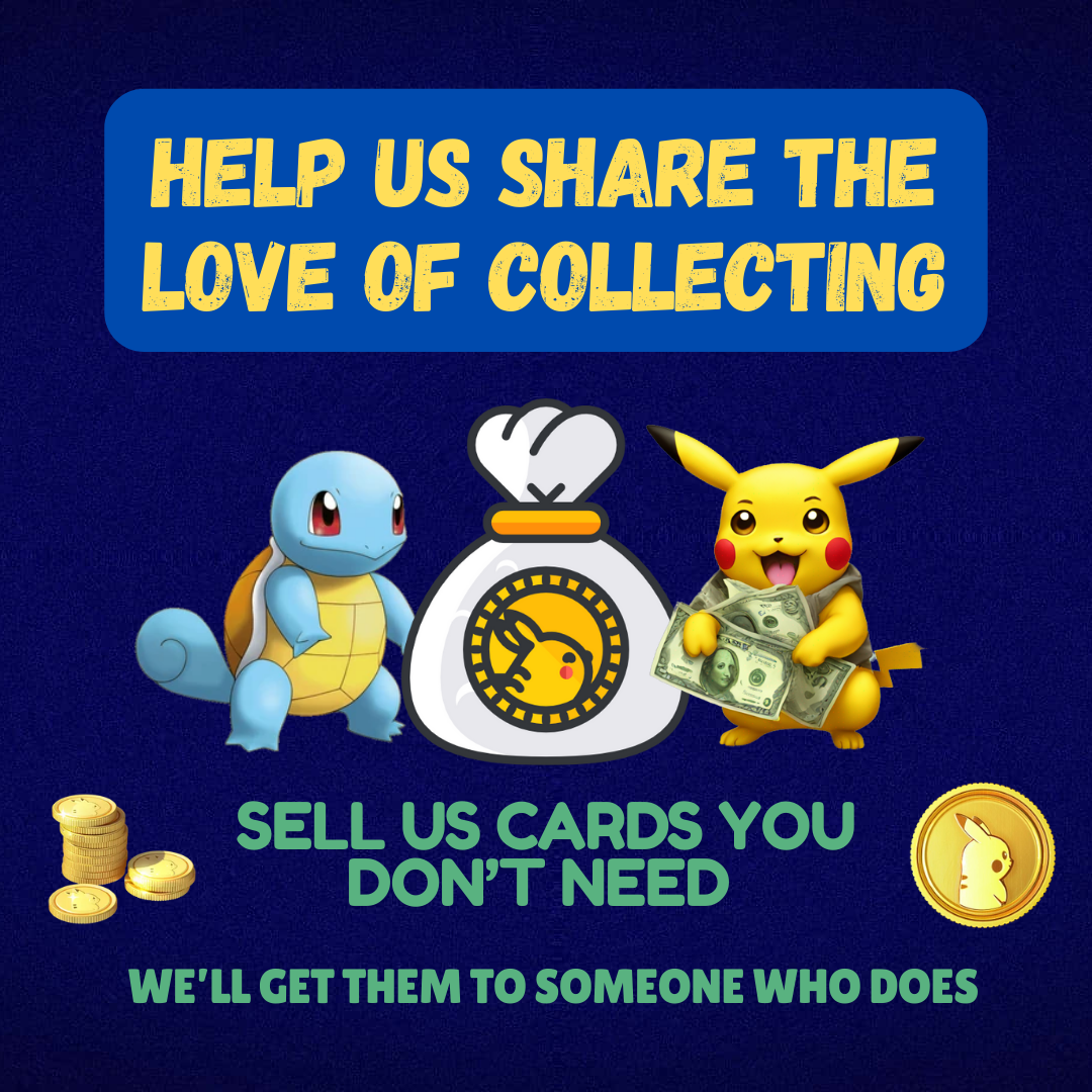 Do you have cards that don't fit your collection? We offer top dollar for your cards, getting you up to 85% of value in store credit or 80% in CASH! We buy English and Japanese singles, slabs, and sealed. Work with us and help others complete their collection goals.
